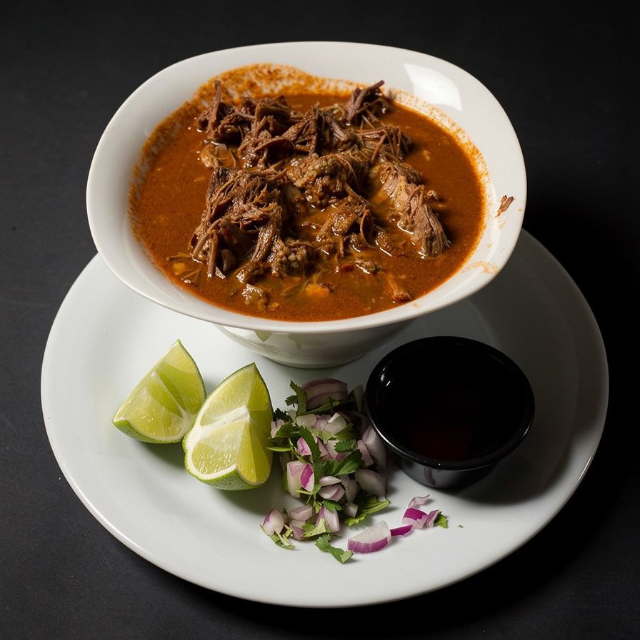 A hearty, traditional birria stew loaded with tender shredded beef in a deep, flavorful consommé. Served with fresh onion, cilantro, lime, and salsa on the side.